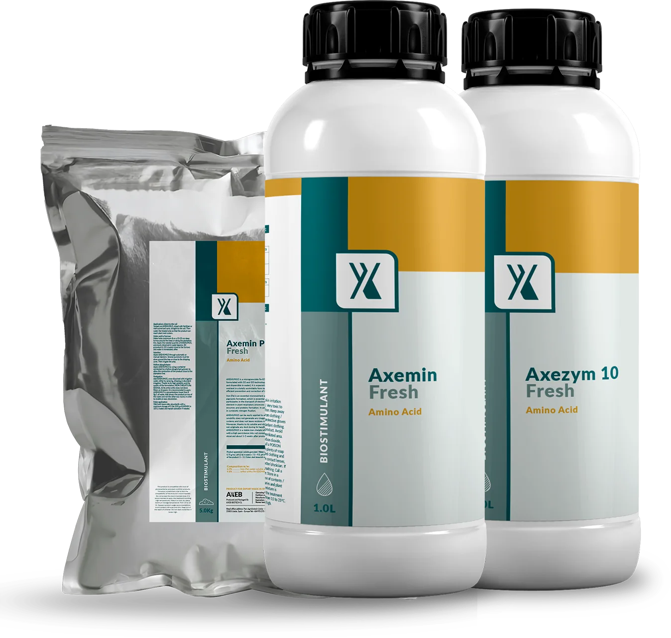 The AXEB Fresh portfolio includes a product derived from plant hydrolysates, providing a natural supply of amino acids to enhance plant performance. Amino acids are the building blocks of proteins and act as precursors of phytohormones, playing a crucial role in plant stress management. By stimulating metabolic activity and enhancing physiological functions such as sprouting, pollination and fruit development, these formulations help crops overcome abiotic stress conditions and achieve maximum performance with more efficient use of resources.