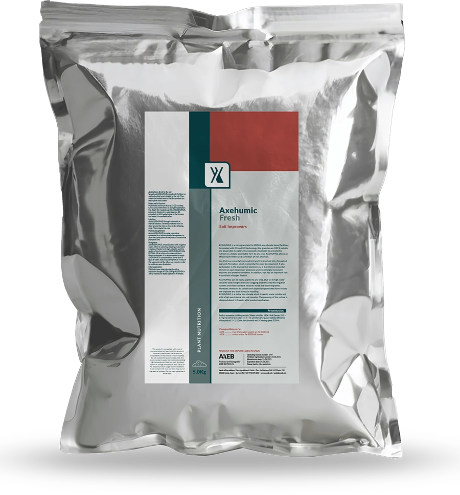 Soil health is also a core focus of the AXEB Fresh line. Products rich in humic acids improve the physical structure of the soil, enhance cation exchange capacity and increase the availability of phosphorus, calcium and other micronutrients that are often fixed in the soil complex. They also activate beneficial microorganisms that support nutrient cycling and maintain a balanced microbial ecosystem. By stimulating root growth and unbinding fixed nutrients, these products contribute to better nutrient absorption, soil fertility and overall crop performance.